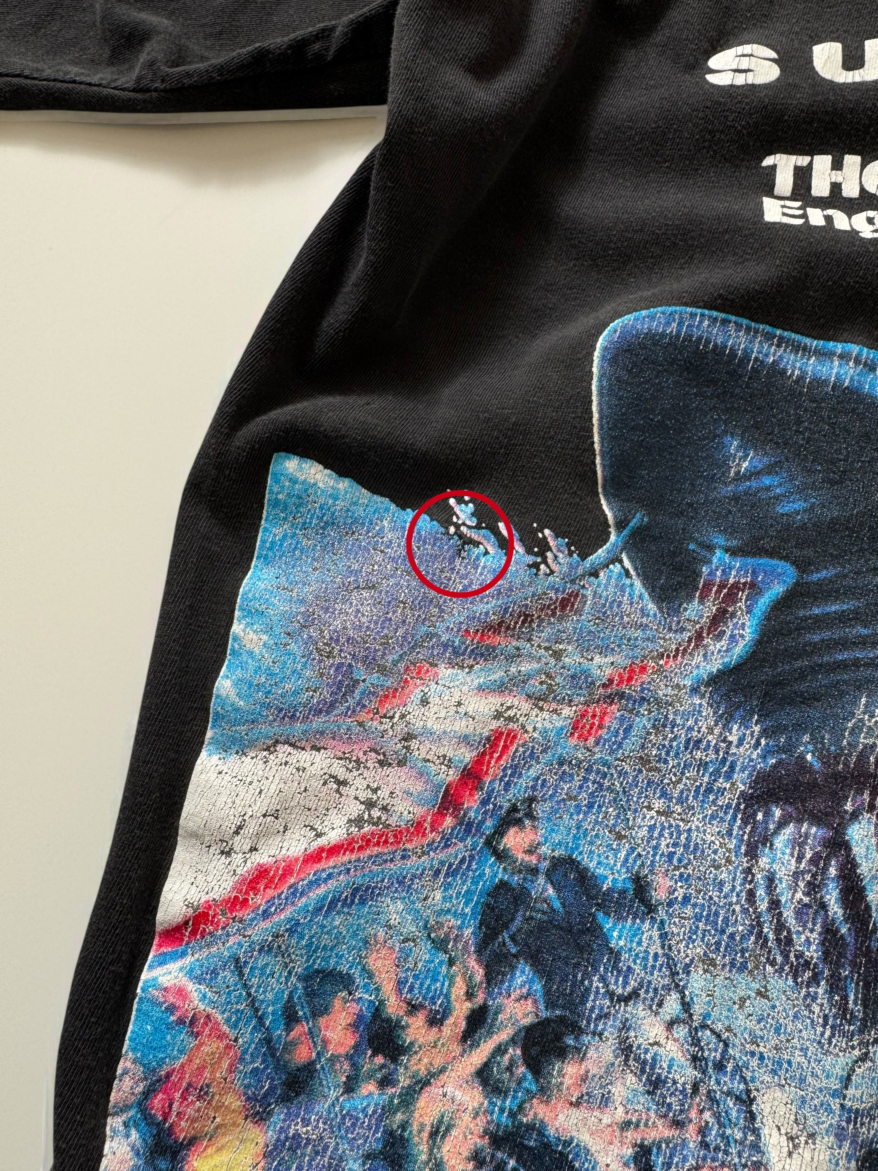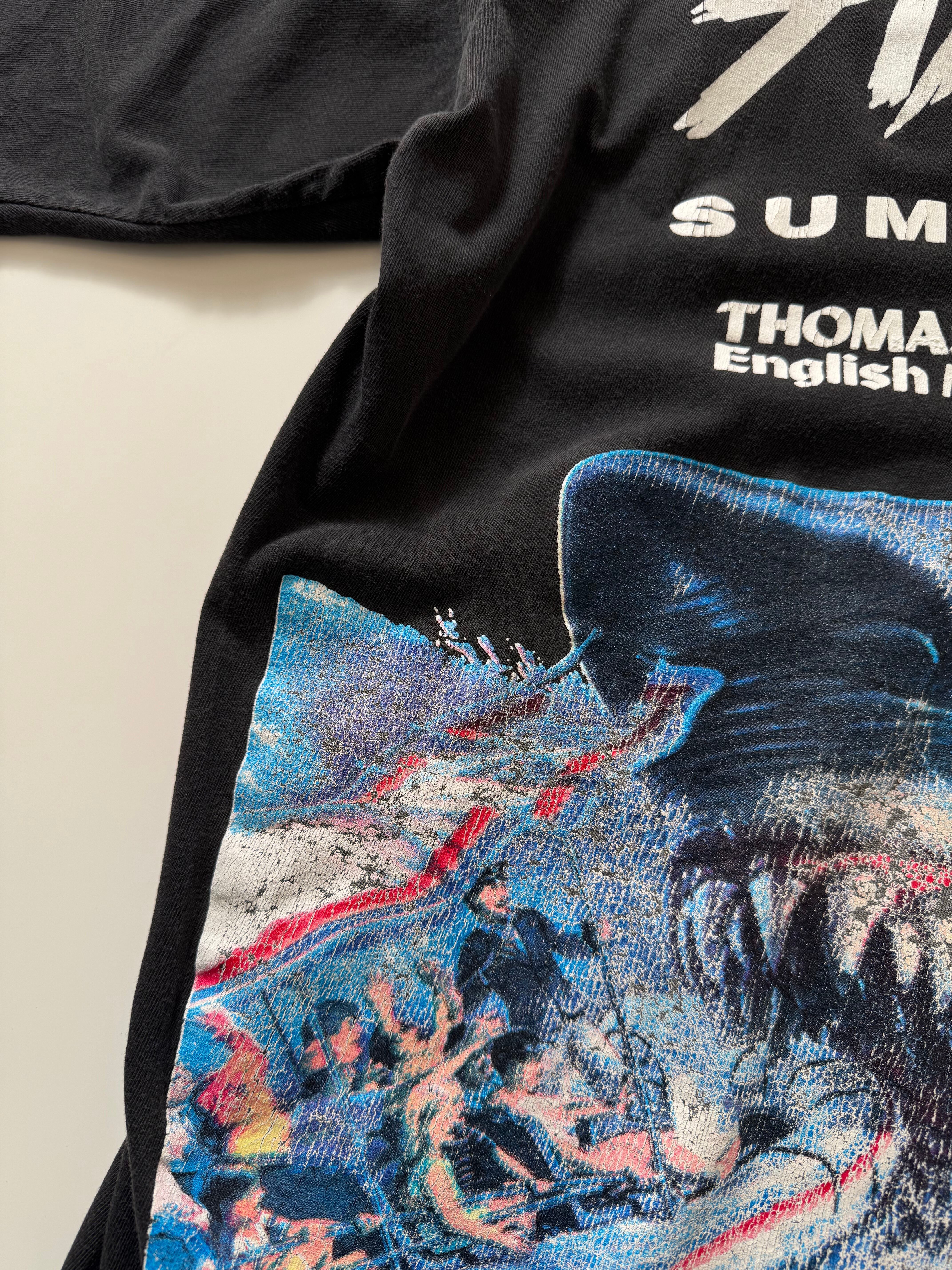 迫力のある構図と細かい描き込み。ビンテージらしい厚塗りのプリントとシングルステッチ。